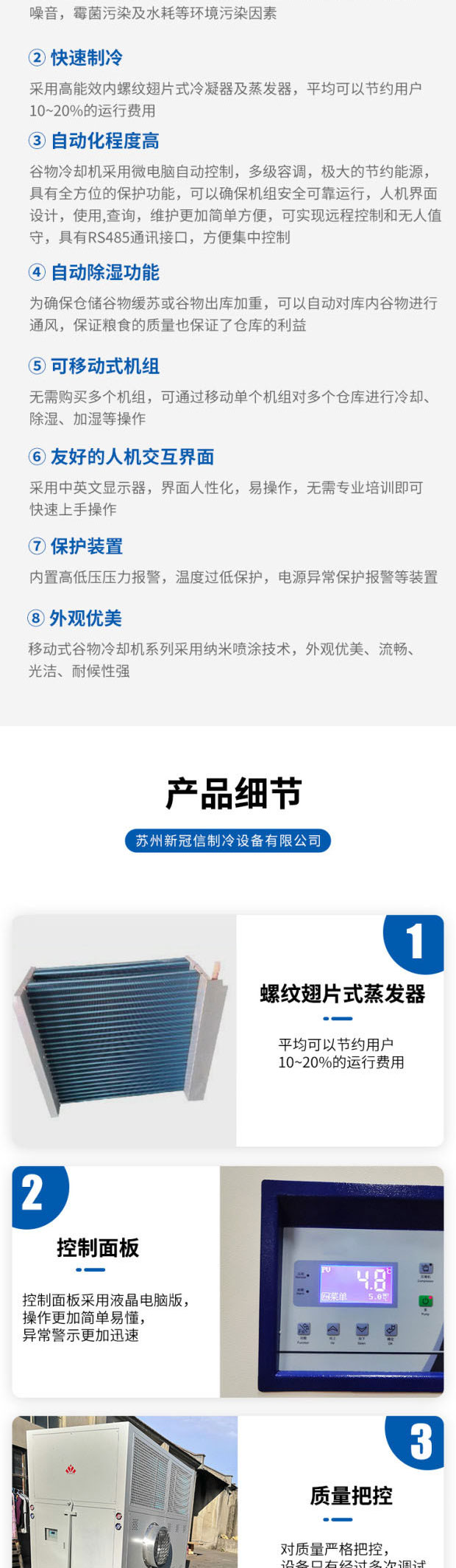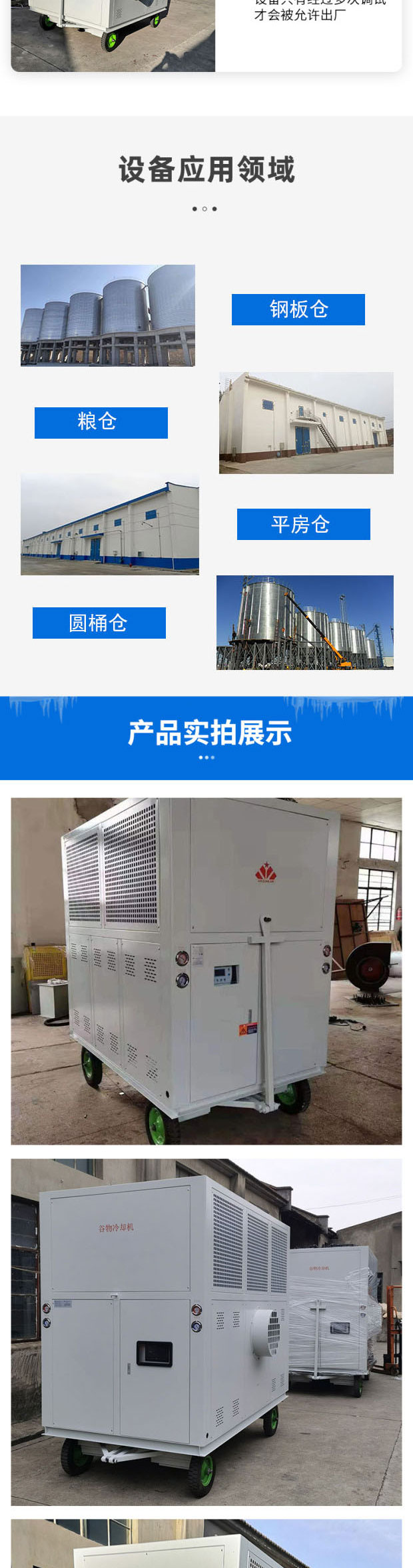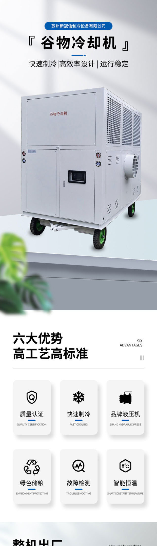 新冠信  供應(yīng)85KW 谷冷機(jī) 風(fēng)冷移動(dòng)式谷冷機(jī) ,選擇變頻式谷冷機(jī)有利于降低能耗。變頻器可根據(jù)冷糧機(jī)出風(fēng)量的大小調(diào)節(jié)風(fēng)機(jī)轉(zhuǎn)速,使風(fēng)機(jī)經(jīng)濟(jì)高效地工作。進(jìn)風(fēng)焓值高時(shí),糧食冷卻器出風(fēng)量小,風(fēng)機(jī)轉(zhuǎn)速慢;進(jìn)風(fēng)焓值低時(shí),出風(fēng)量大,風(fēng)機(jī)轉(zhuǎn)速快。沒有變頻器的糧食冷卻器總是滿負(fù)荷運(yùn)行,因此能耗相對(duì)較高。